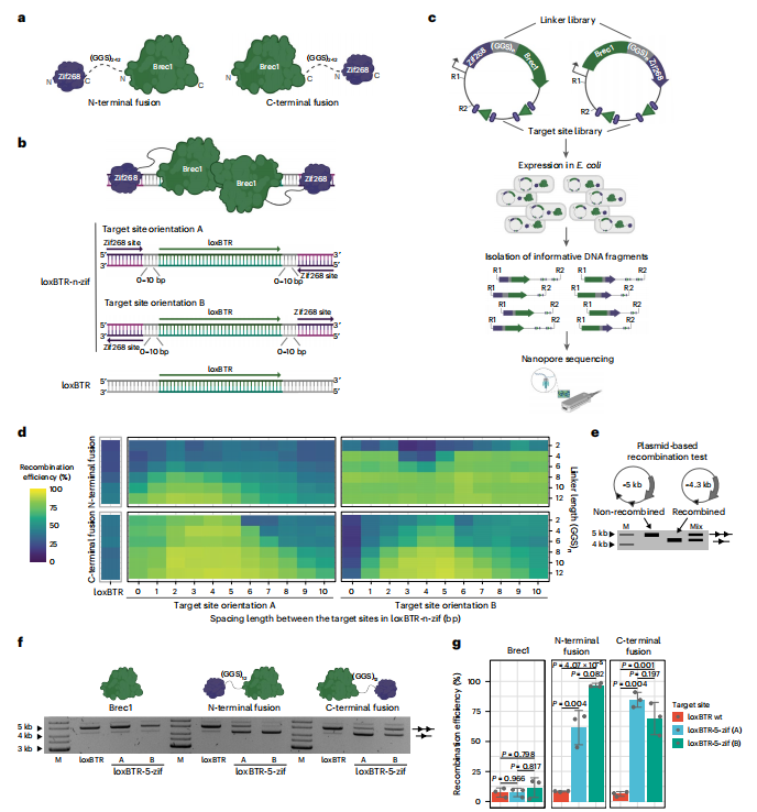 结果表明,与非融合重组酶相比,连接子长度、靶点间距和方向的最佳组合显示出更高的重组率,这可能是因为ZFD与其位点的结合给予了对DNA的额外亲和力。N-末端和C-末端文库的活性都得到了最大的提高,当连接子的重复数为12×GGS,LOXBTR和ZIF结合基序之间的间隔子长度为5 BP,在低重组酶表达水平的质粒试验中对最佳组合的测试显示,平均重组效率为85%(C-末端Brec1-Zif268在loxBTR-5-ZIF(A)位点融合),而WT-Brec1在相同条件下平均重组质粒为7%(图1e-g)。因此,ZFD的融合显著提高了工程重组酶的重组效率。